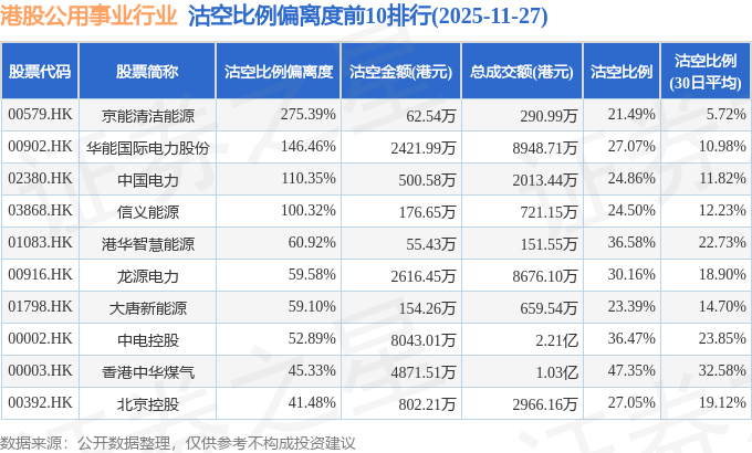 从沽空比例偏离度来看,京能清洁能源、华能国际电力股份、中国电力沽空比例偏离度位居行业前三,分别为275.39%、146.46%、110.35%。
