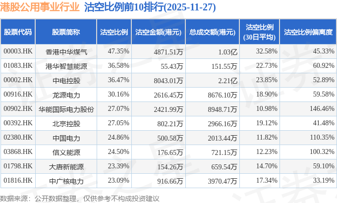从沽空比例来看,香港中华煤气、港华智慧能源、中电控股沽空比例位居行业前三,分别为47.35%、36.58%、36.47%。
