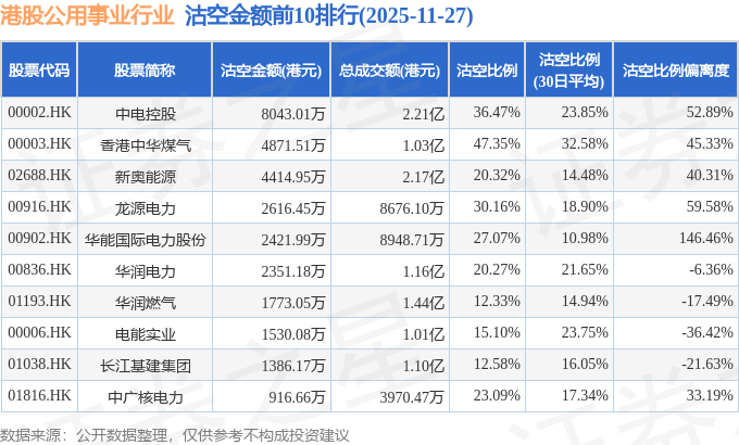 从沽空金额来看,中电控股、香港中华煤气、新奥能源沽空金额位居行业前三,分别为8043.01万港元、4871.51万港元、4414.95万港元。
