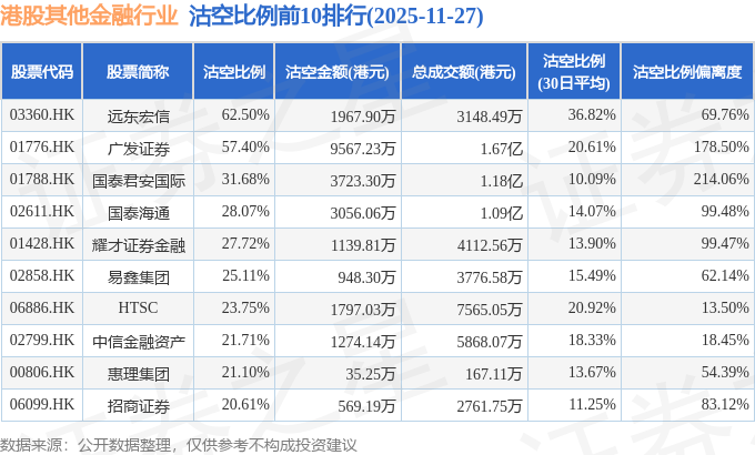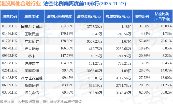从沽空比例偏离度来看,国泰君安国际、国联民生、广发证券沽空比例偏离度位居行业前三,分别为214.06%、179.18%、178.5%。