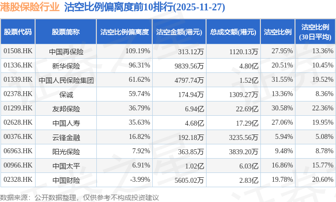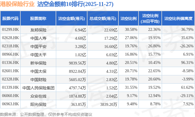 从沽空金额来看,友邦保险、中国人寿、中国平安沽空金额位居行业前三,分别为6.94亿港元、4.68亿港元、3.28亿港元。