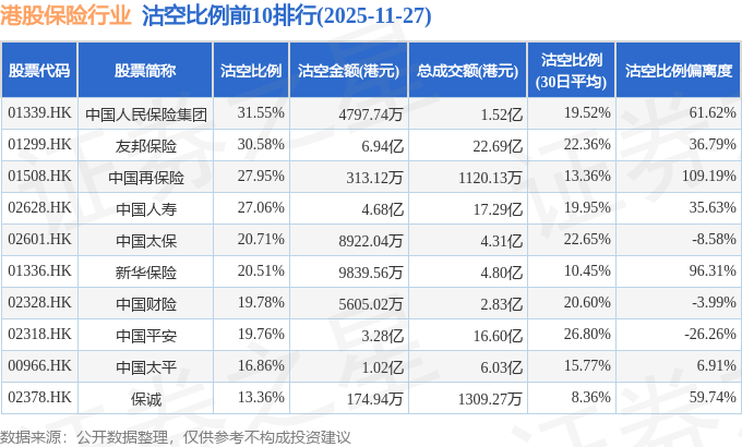 从沽空比例来看,中国人民保险集团、友邦保险、中国再保险沽空比例位居行业前三,分别为31.55%、30.58%、27.95%。