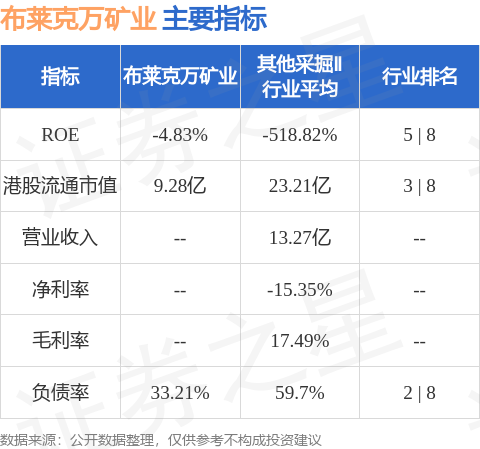 布莱克万矿业港股市值9.28亿港元,在其他采掘Ⅱ行业中排名第3。主要指标见下表: