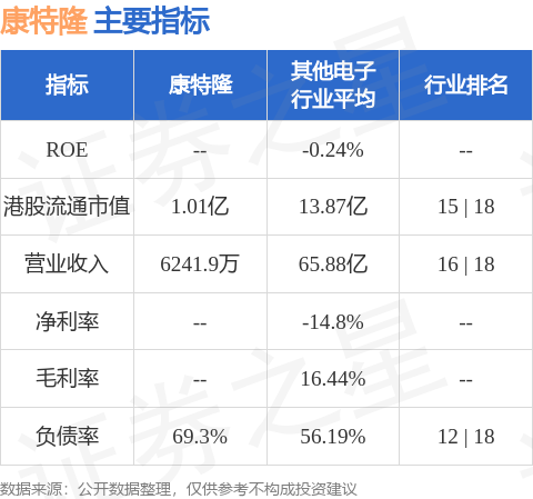 康特隆港股市值1.01亿港元,在其他电子行业中排名第15。主要指标见下表: