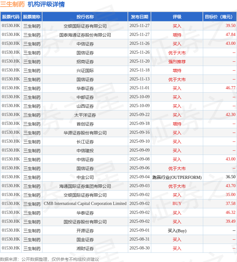 投行对该股的评级以买入为主,近90天内共有15家投行给出买入评级,近90天的目标均价为41.75港元。交银国际证券有限公司最新一份研报给予三生制药买入评级,目标价39.5港元。