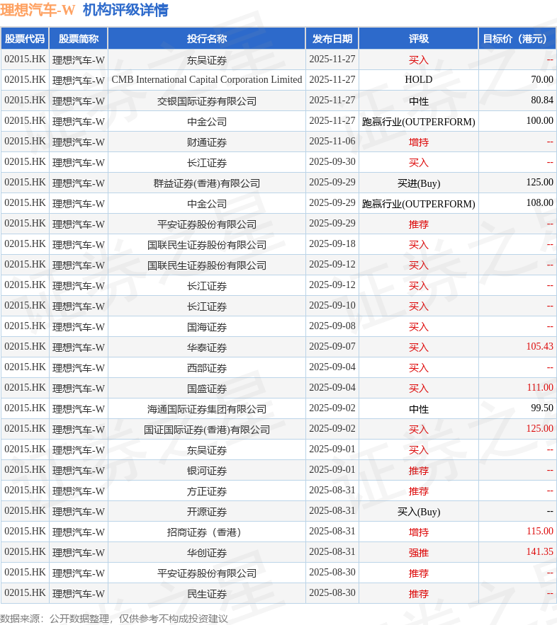 投行对该股的评级以买入为主,近90天内共有12家投行给出买入评级,近90天的目标均价为107.37港元。东吴证券最新一份研报给予理想汽车-W买入评级。