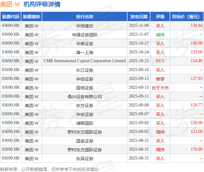 截至2025年11月28日收盘,美团-W(03690.HK)报收于102.5港元,下跌1.44%,成交量4378.59万股,成交额45.23亿港元。投行对该股的评级以买入为主,近90天内共有10家投行给出买入评级,近90天的目标均价为139.99港元。中信建投最新一份研报给予美团-W买入评级,目标价139.84港元。
