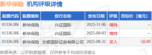 截至2025年11月28日收盘,新华保险(01336.HK)报收于46.38港元,下跌1.45%,成交量707.96万股,成交额3.29亿港元。投行对该股的评级以增持为主,近90天内共有2家投行给出增持评级,近90天的目标均价为58港元。兴证国际最新一份研报给予新华保险增持评级。
