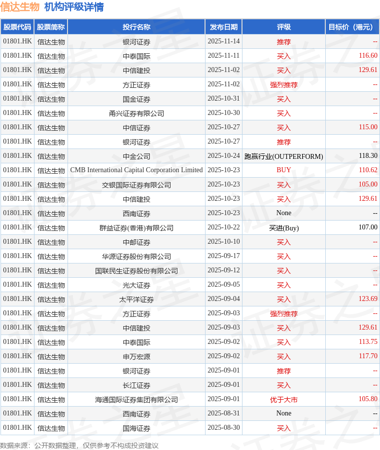 截至2025年11月28日收盘,信达生物(01801.HK)报收于94.1港元,下跌2.18%,成交量1105.25万股,成交额10.39亿港元。投行对该股的评级以买入为主,近90天内共有17家投行给出买入评级,近90天的目标均价为117.1港元。银河证券最新一份研报给予信达生物推荐评级。