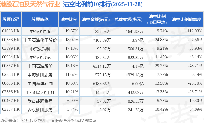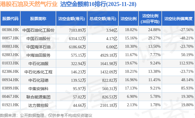 从沽空金额来看,中国石油化工股份、中国石油股份、中国海洋石油沽空金额位居行业前三,分别为7103.89万港元、6314.12万港元、6186.66万港元。