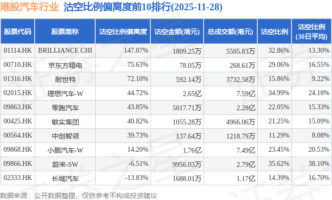 从沽空比例偏离度来看,BRILLIANCE CHI、京东方精电、耐世特沽空比例偏离度位居行业前三,分别为147.07%、75.63%、72.1%。