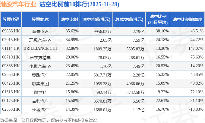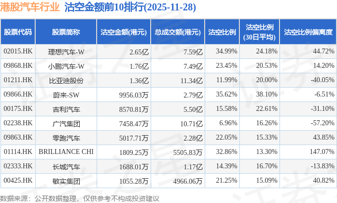 从沽空金额来看,理想汽车-W、小鹏汽车-W、比亚迪股份沽空金额位居行业前三,分别为2.65亿港元、1.76亿港元、1.36亿港元。
