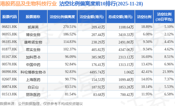从沽空比例偏离度来看,凯莱英、博安生物、康希诺生物沽空比例偏离度位居行业前三,分别为270.51%、186.52%、114.83%。
