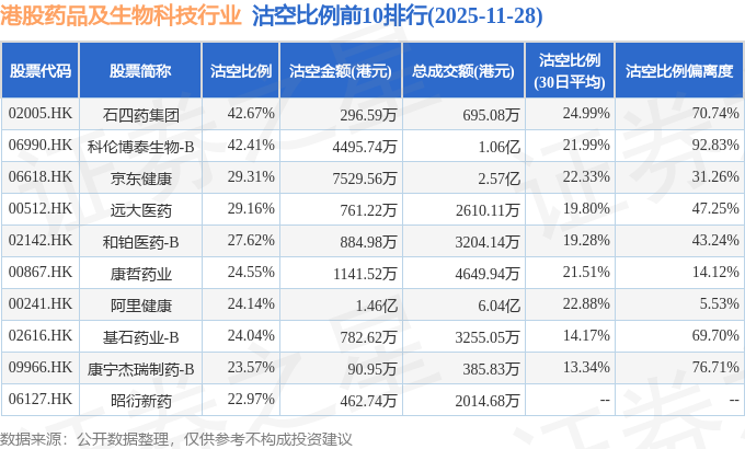 从沽空比例来看,石四药集团、科伦博泰生物-B、京东健康沽空比例位居行业前三,分别为42.67%、42.41%、29.31%。