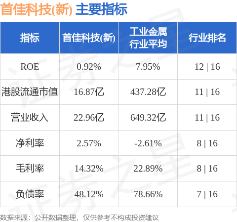 首佳科技(新)港股市值16.87亿港元,在工业金属行业中排名第11。主要指标见下表: