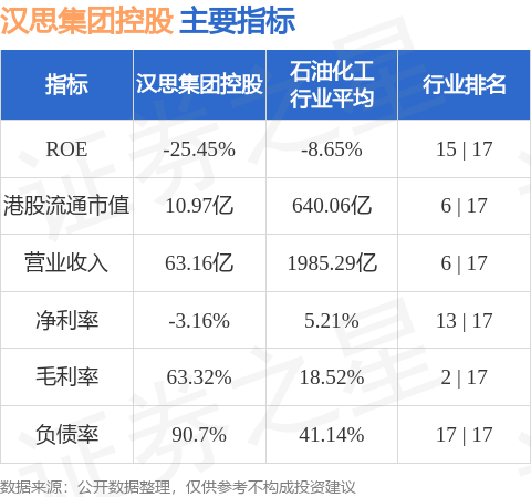 汉思集团控股港股市值10.97亿港元,在石油化工行业中排名第6。主要指标见下表: