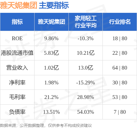 雅天妮集团港股市值5.83亿港元,在家用轻工行业中排名第22。主要指标见下表: