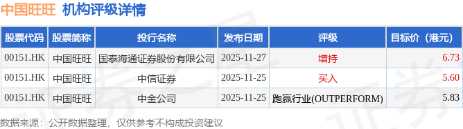 截至2025年11月28日收盘,中国旺旺(00151.HK)报收于4.66港元,下跌0.43%,成交量1274.8万股,成交额5945.12万港元。投行对该股的评级以跑赢行业(OUTPERFORM)为主,近90天内共有1家投行给出跑赢行业(OUTPERFORM)评级,近90天的目标均价为6.05港元。国泰海通证券股份有限公司最新一份研报给予中国旺旺增持评级,目标价6.73港元。