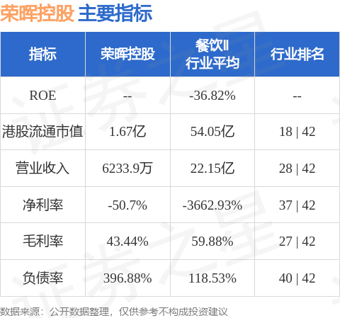 荣晖控股港股市值1.67亿港元,在餐饮Ⅱ行业中排名第18。主要指标见下表: