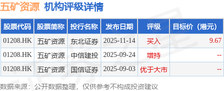 投行对该股的评级以增持为主,近90天内共有1家投行给出增持评级,近90天的目标均价为9.67港元。东北证券最新一份研报给予五矿资源买入评级,目标价9.67港元。