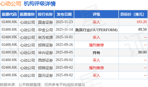 投行对该股的评级以买入为主,近90天内共有4家投行给出买入评级,近90天的目标均价为90.9港元。国金证券最新一份研报给予心动公司买入评级,目标价103.2港元。