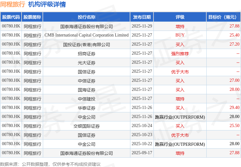 投行对该股的评级以买入为主,近90天内共有6家投行给出买入评级,近90天的目标均价为27.43港元。国泰海通证券股份有限公司最新一份研报给予同程旅行增持评级,目标价27.88港元。
