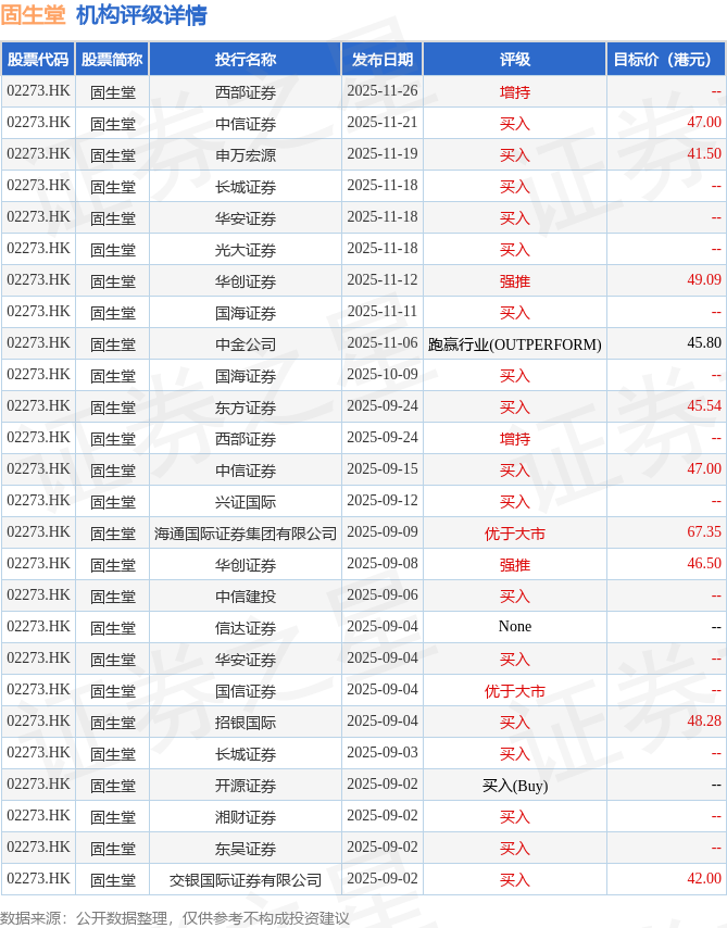 截至2025年12月1日收盘,固生堂(02273.HK)报收于29.08港元,下跌2.81%,成交量81.53万股,成交额2398.1万港元。投行对该股的评级以买入为主,近90天内共有17家投行给出买入评级,近90天的目标均价为48.01港元。西部证券最新一份研报给予固生堂增持评级。