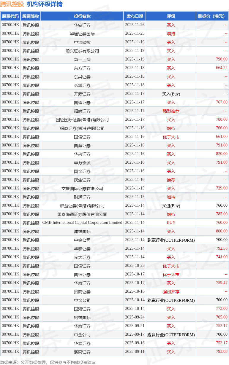 截至2025年12月1日收盘,腾讯控股(00700.HK)报收于619.5港元,上涨1.31%,成交量1264.33万股,成交额78.13亿港元。投行对该股的评级以买入为主,近90天内共有23家投行给出买入评级,近90天的目标均价为753.63港元。华安证券最新一份研报给予腾讯控股买入评级。