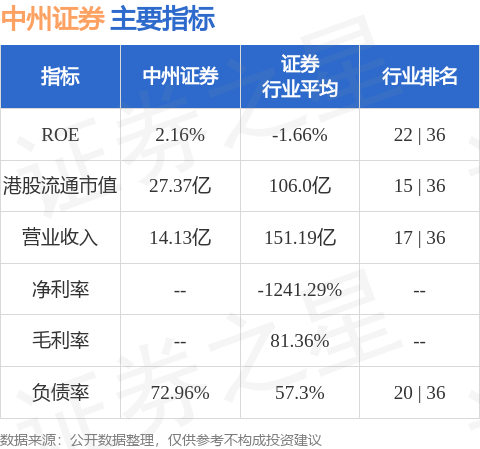 中州证券港股市值27.37亿港元,在证券行业中排名第15。主要指标见下表: