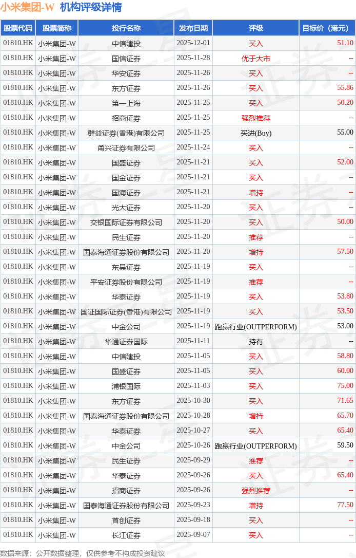 截至2025年12月1日收盘,小米集团-W(01810.HK)报收于40.3港元,下跌1.76%,成交量1.95亿股,成交额78.61亿港元。投行对该股的评级以买入为主,近90天内共有20家投行给出买入评级,近90天的目标均价为59.52港元。中信建投最新一份研报给予小米集团-W买入评级,目标价51.1港元。