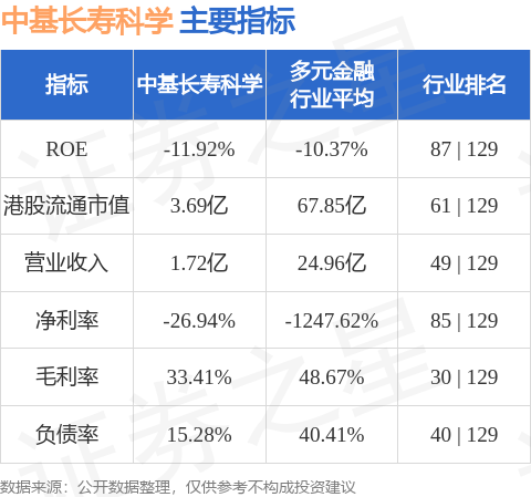 中基长寿科学港股市值3.69亿港元,在多元金融行业中排名第61。主要指标见下表: