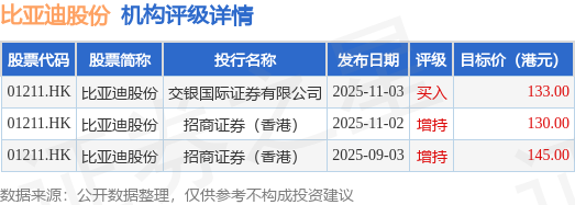 投行对该股的评级以增持为主,近90天内共有2家投行给出增持评级,近90天的目标均价为136港元。交银国际证券有限公司最新一份研报给予比亚迪股份买入评级,目标价133港元。