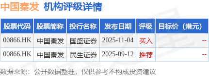 截至2025年12月2日收盘,中国秦发(00866.HK)报收于3.04港元,上涨2.01%,成交量458.2万股,成交额1370.53万港元。投行对该股的评级以推荐为主,近90天内共有1家投行给出推荐评级。国盛证券最新一份研报给予中国秦发买入评级。