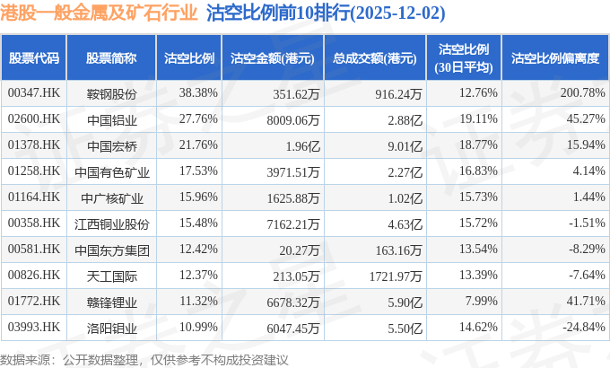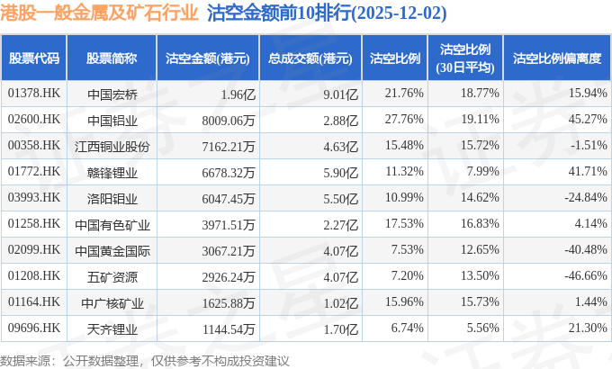 从沽空金额来看,中国宏桥、中国铝业、江西铜业股份沽空金额位居行业前三,分别为1.96亿港元、8009.06万港元、7162.21万港元。