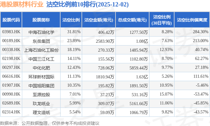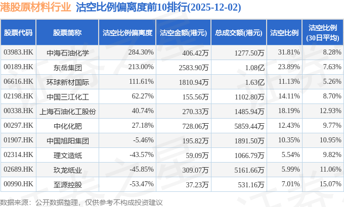 从沽空比例偏离度来看,中海石油化学、东岳集团、环球新材国际沽空比例偏离度位居行业前三,分别为284.3%、213%、111.61%。