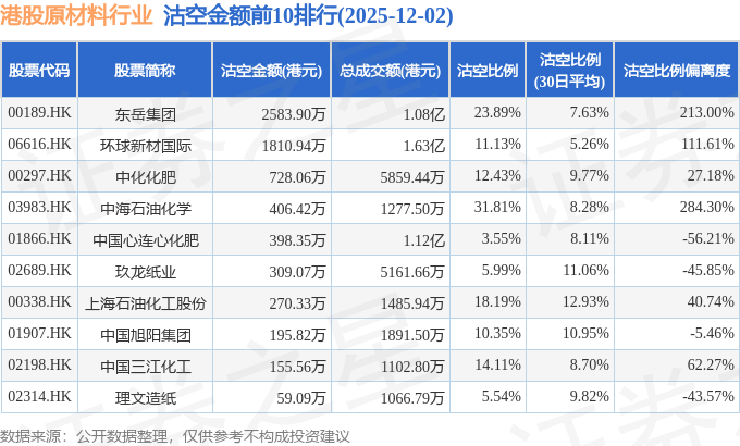 从沽空金额来看,东岳集团、环球新材国际、中化化肥沽空金额位居行业前三,分别为2583.9万港元、1810.94万港元、728.06万港元。