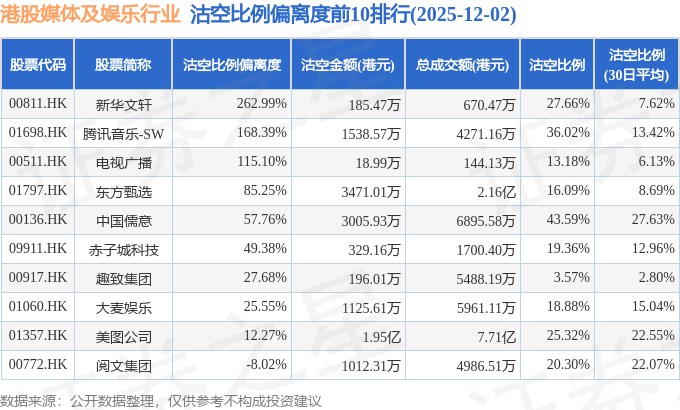 从沽空比例偏离度来看,新华文轩、腾讯音乐-SW、电视广播沽空比例偏离度位居行业前三,分别为262.99%、168.39%、115.1%。
