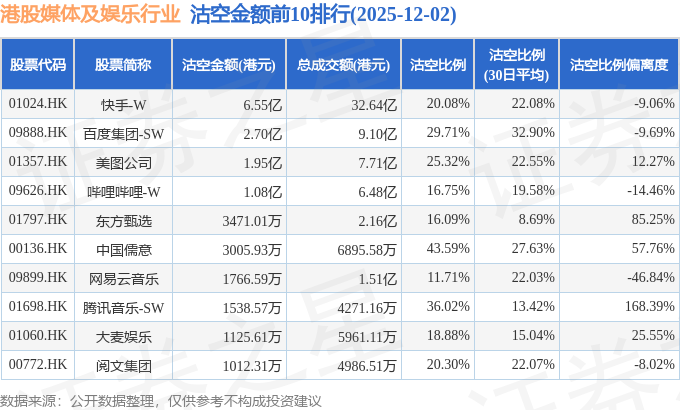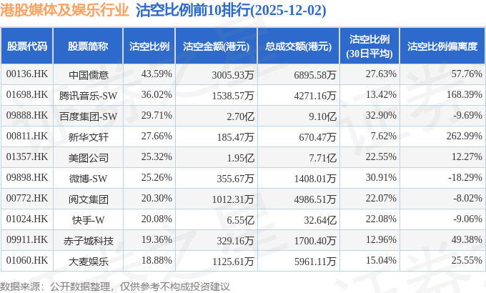 从沽空比例来看,中国儒意、腾讯音乐-SW、百度集团-SW沽空比例位居行业前三,分别为43.59%、36.02%、29.71%。