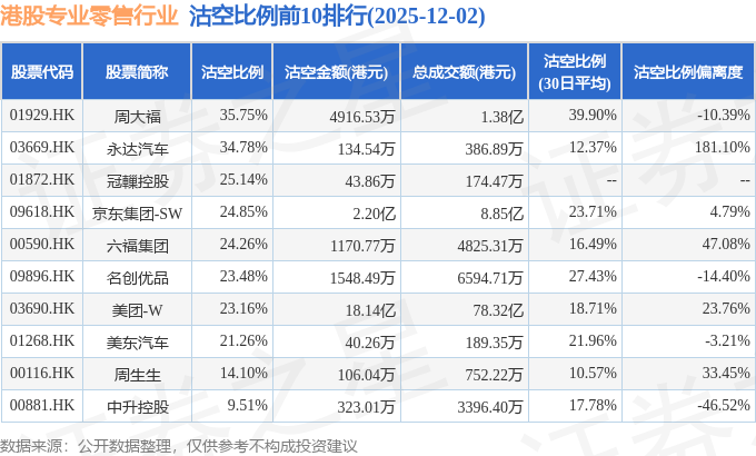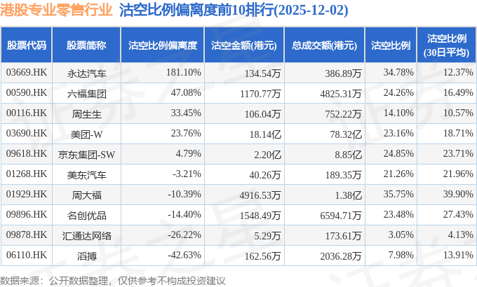 从沽空比例偏离度来看,永达汽车、六福集团、周生生沽空比例偏离度位居行业前三,分别为181.1%、47.08%、33.45%。