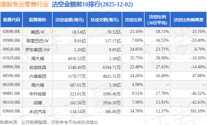 由于港股人民币柜台交易股票成交金额较小,沽空比例普遍偏高,为了避免干扰,已将人民币柜台交易股票从排行表格中剔除。