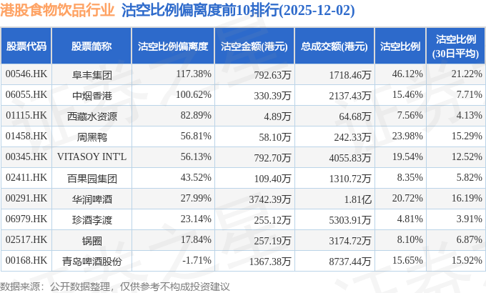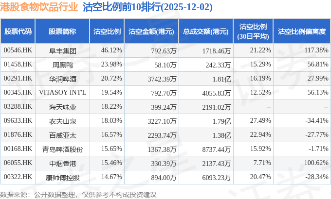 从沽空比例来看,阜丰集团、周黑鸭、华润啤酒沽空比例位居行业前三,分别为46.12%、23.98%、20.72%。
