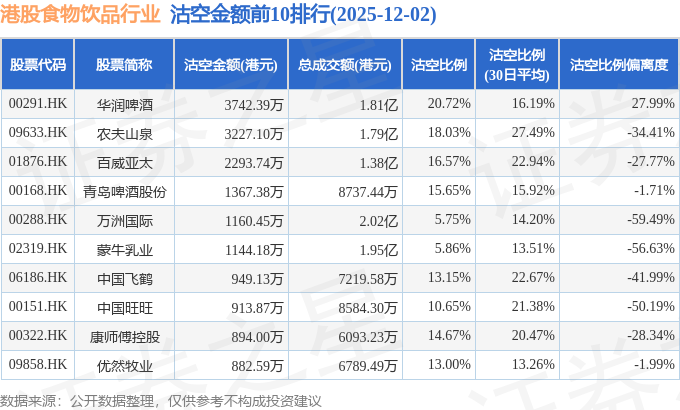 从沽空金额来看,华润啤酒、农夫山泉、百威亚太沽空金额位居行业前三,分别为3742.39万港元、3227.1万港元、2293.74万港元。