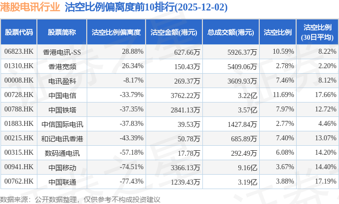 从沽空比例偏离度来看,香港电讯-SS、香港宽频、电讯盈科沽空比例偏离度位居行业前三,分别为28.88%、26.34%、-8.17%。