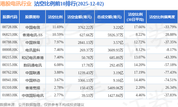 从沽空金额来看,中国电信、中国移动、中国铁塔沽空金额位居行业前三,分别为3762.22万港元、3366.13万港元、2841.13万港元。