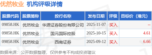 投行对该股的评级以买入为主,近90天内共有3家投行给出买入评级,近90天的目标均价为5.64港元。华源证券股份有限公司最新一份研报给予优然牧业买入评级。