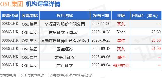 投行对该股的评级以增持为主,近90天内共有2家投行给出增持评级,近90天的目标均价为22.31港元。华源证券股份有限公司最新一份研报给予OSL集团买入评级。