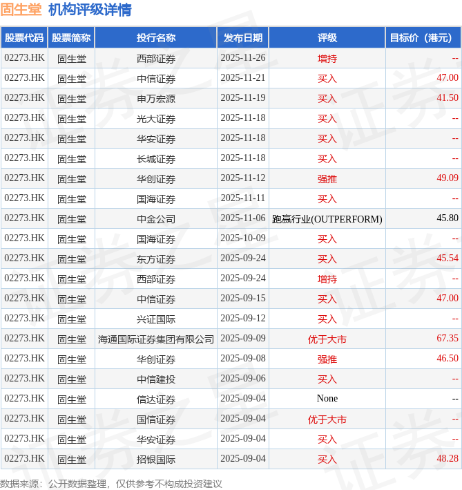 截至2025年12月3日收盘,固生堂(02273.HK)报收于28.7港元,下跌1.37%,成交量104.25万股,成交额2990.16万港元。投行对该股的评级以买入为主,近90天内共有13家投行给出买入评级,近90天的目标均价为48.67港元。西部证券最新一份研报给予固生堂增持评级。