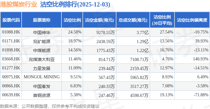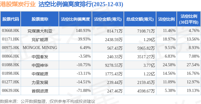 证券之星消息,12月3日港交所披露数据显示,当日港股煤炭行业的22只个股中有8只被沽空,总沽空股数为1016.83万股,总沽空金额为1.56亿元(港元),而当日煤炭行业的总成交金额为8.66亿元(港元),沽空比例为18.01%。当日煤炭行业总体涨0.42%。