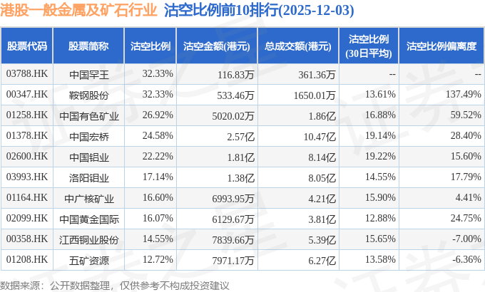 从沽空比例来看,中国罕王、鞍钢股份、中国有色矿业沽空比例位居行业前三,分别为32.33%、32.33%、26.92%。