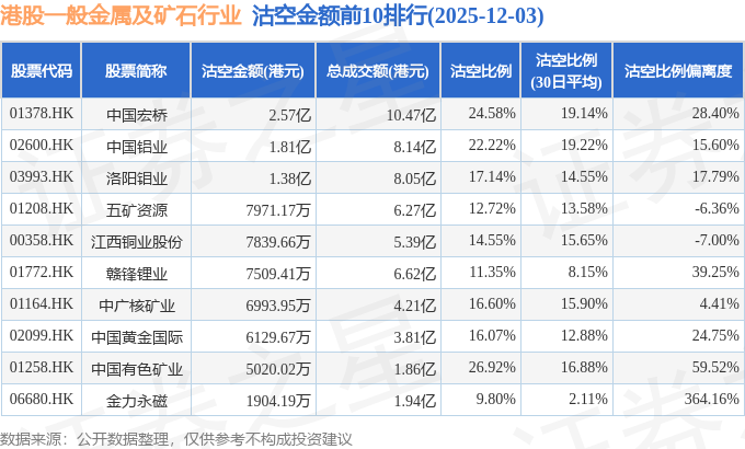 从沽空金额来看,中国宏桥、中国铝业、洛阳钼业沽空金额位居行业前三,分别为2.57亿港元、1.81亿港元、1.38亿港元。